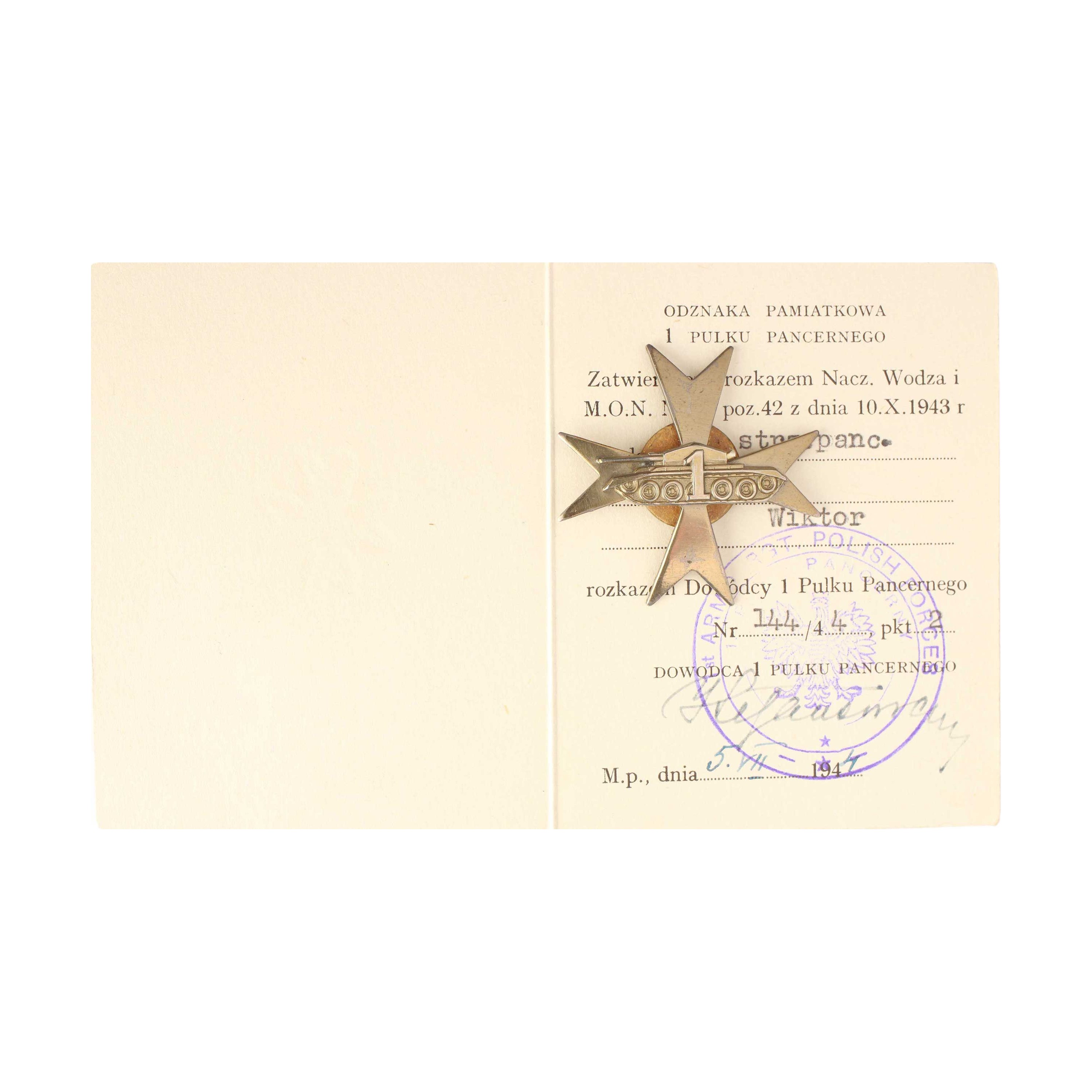 - legitymacja uprawniająca do noszenia odznaki 1 Pułku Pancernego wraz z oznaką
