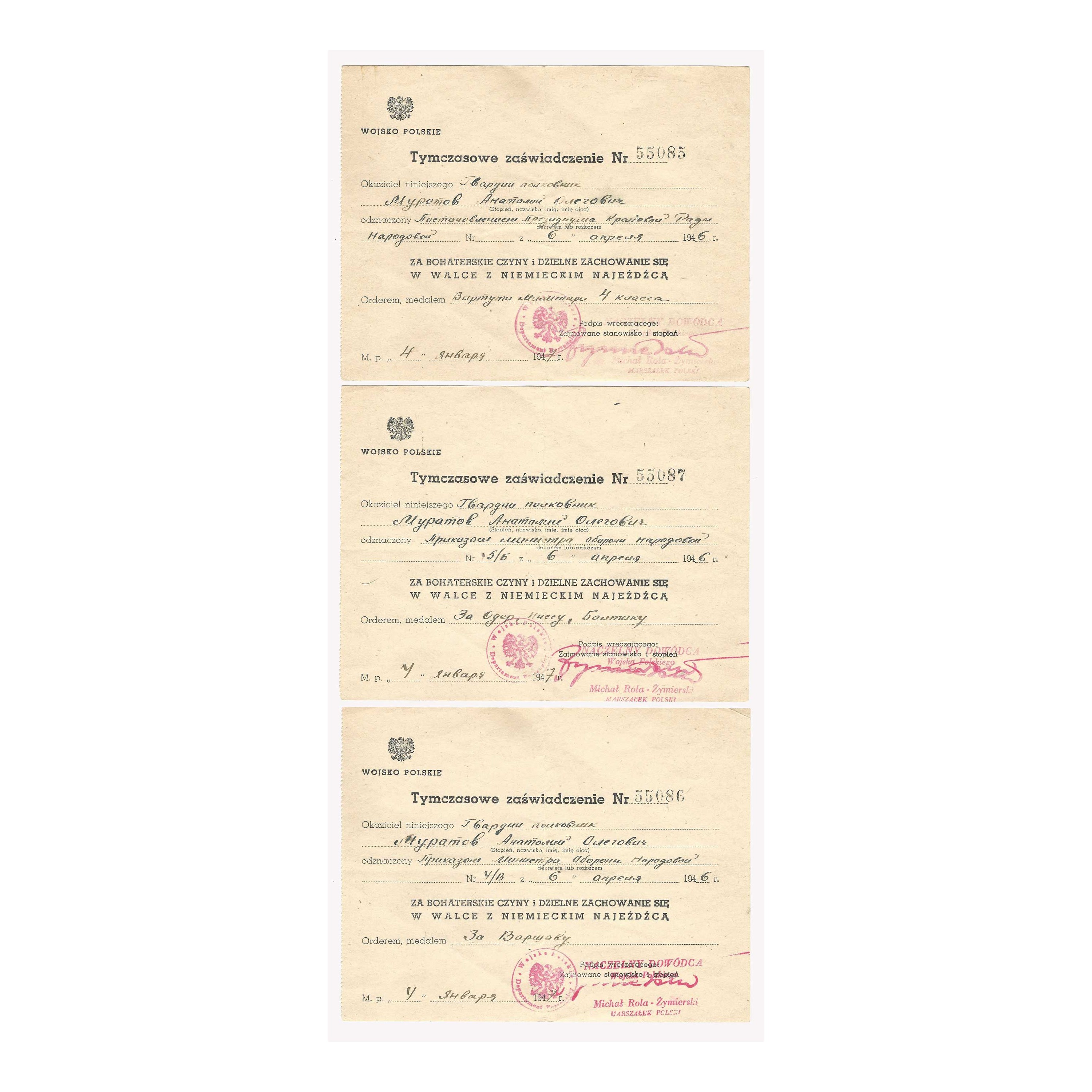 W komplecie dwa kolejne dokumenty wystawione na to samo nazwisko i potwierdzające nadanie "Medalu za Warszawę"