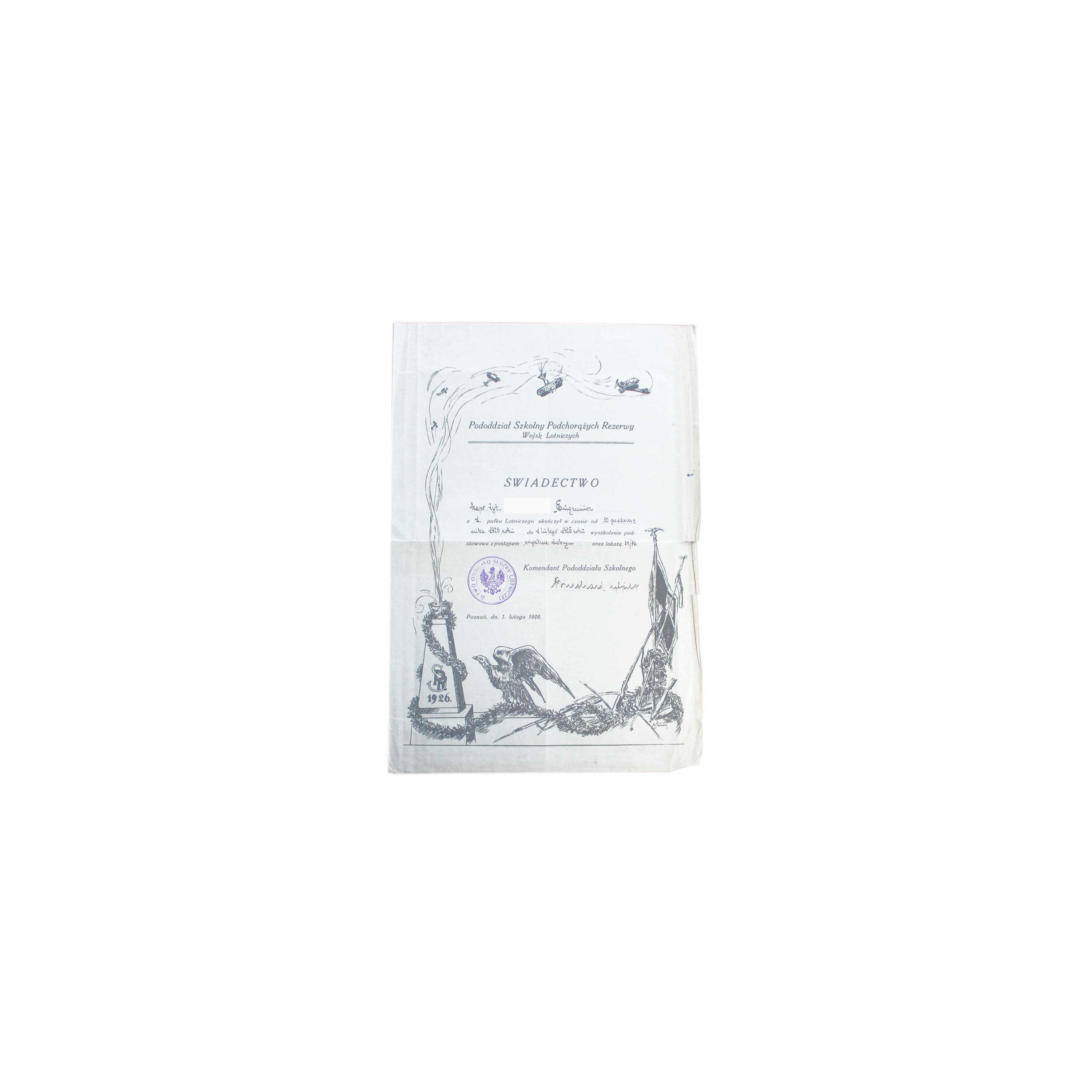 Dyplom poświadczający ukończenie 1 lutego 1926 roku kursu w Pododdziale Szkolnym Podchorążych Rezerwy Wojsk Lotniczych.
