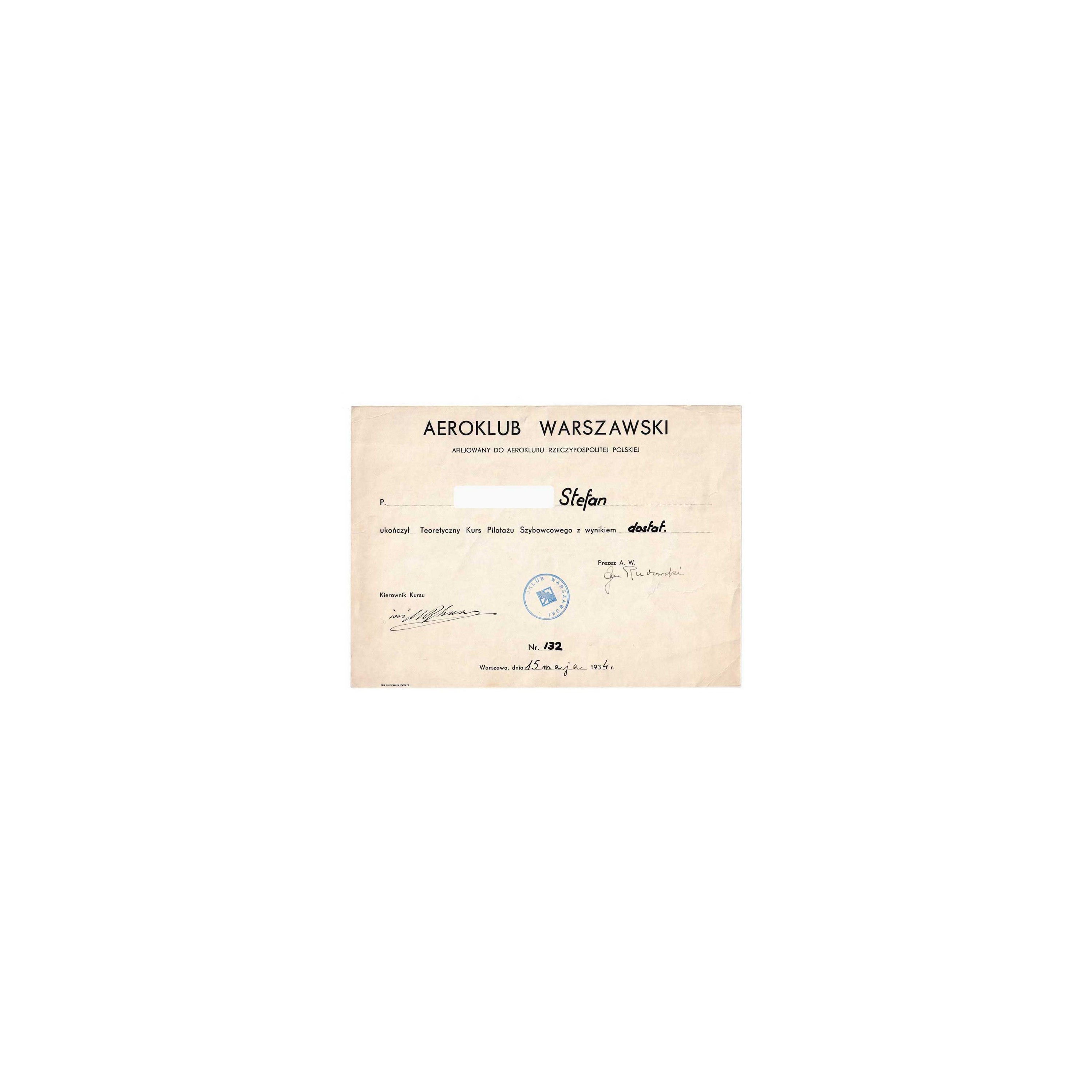 Pieczęć Aeroklubu Warszawskiego, podpis jego prezesa oraz kierownika kursu.