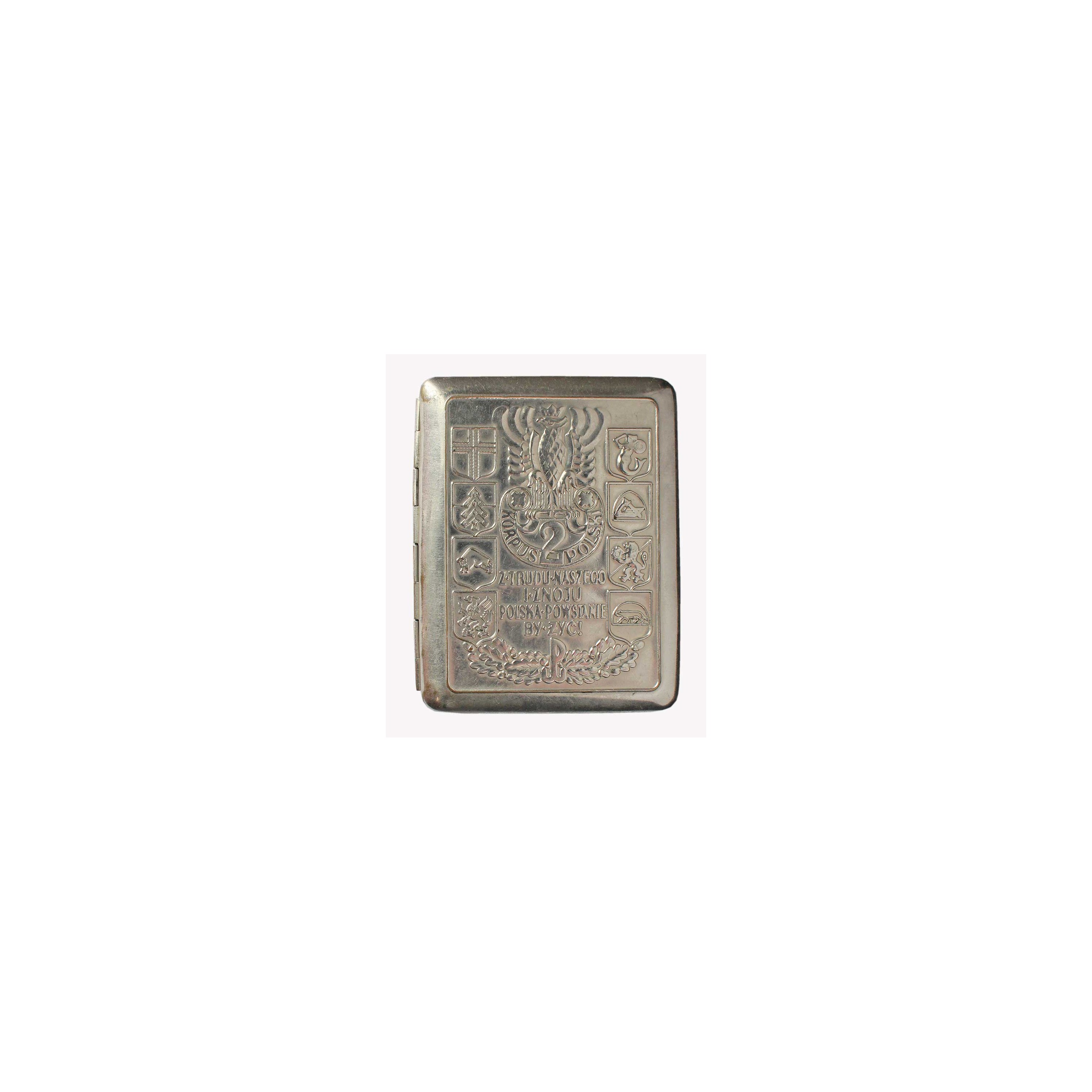 Na wieczku wytłoczony orzeł wojskowy, oznaki formacji 2 Korpusu oraz znak Polski Walczącej.
