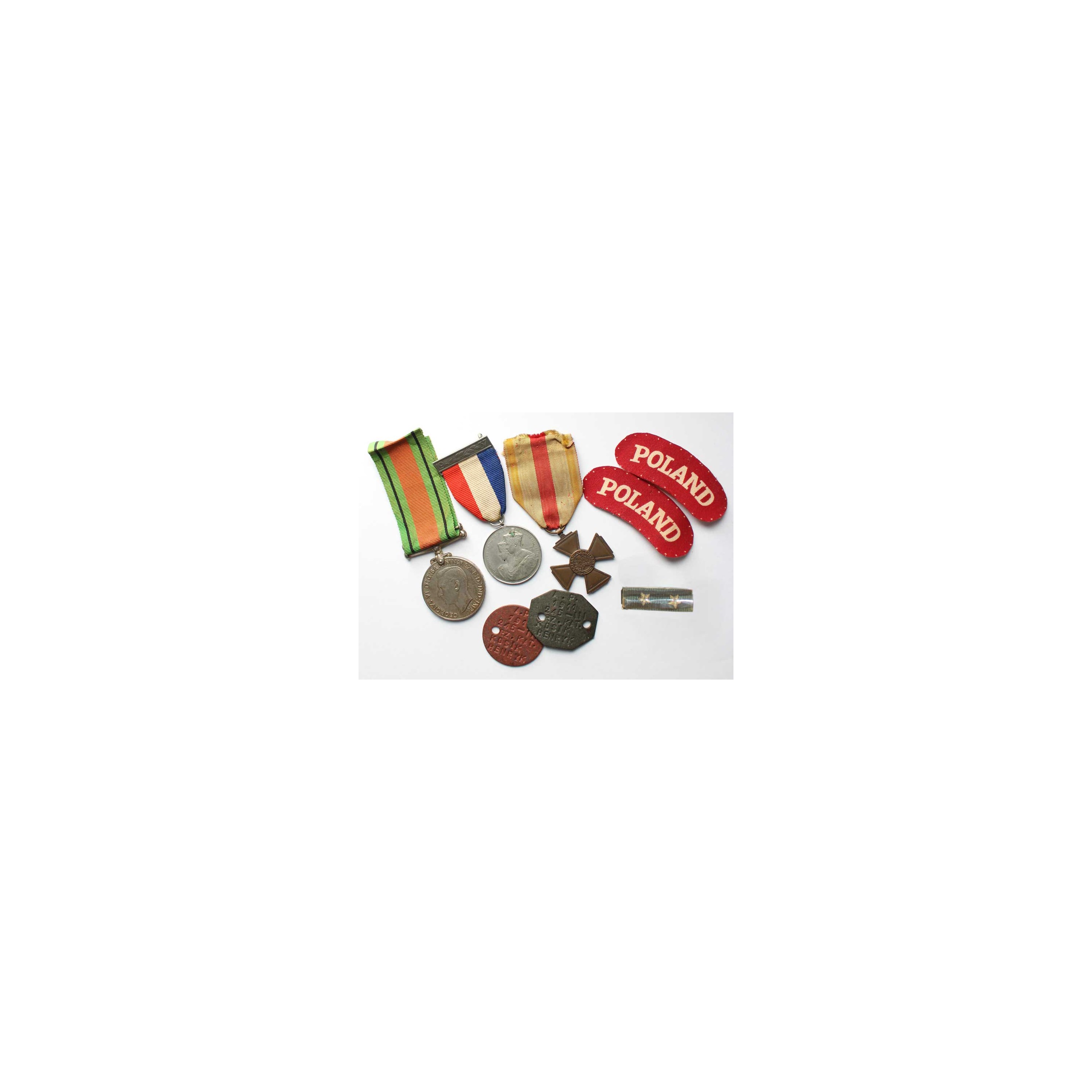 Zestaw pamiątek obejmujący dwa odznaczenia brytyjskie, jedno francuskie, oznakę „Za Rany” oraz komplet nieśmiertelników.