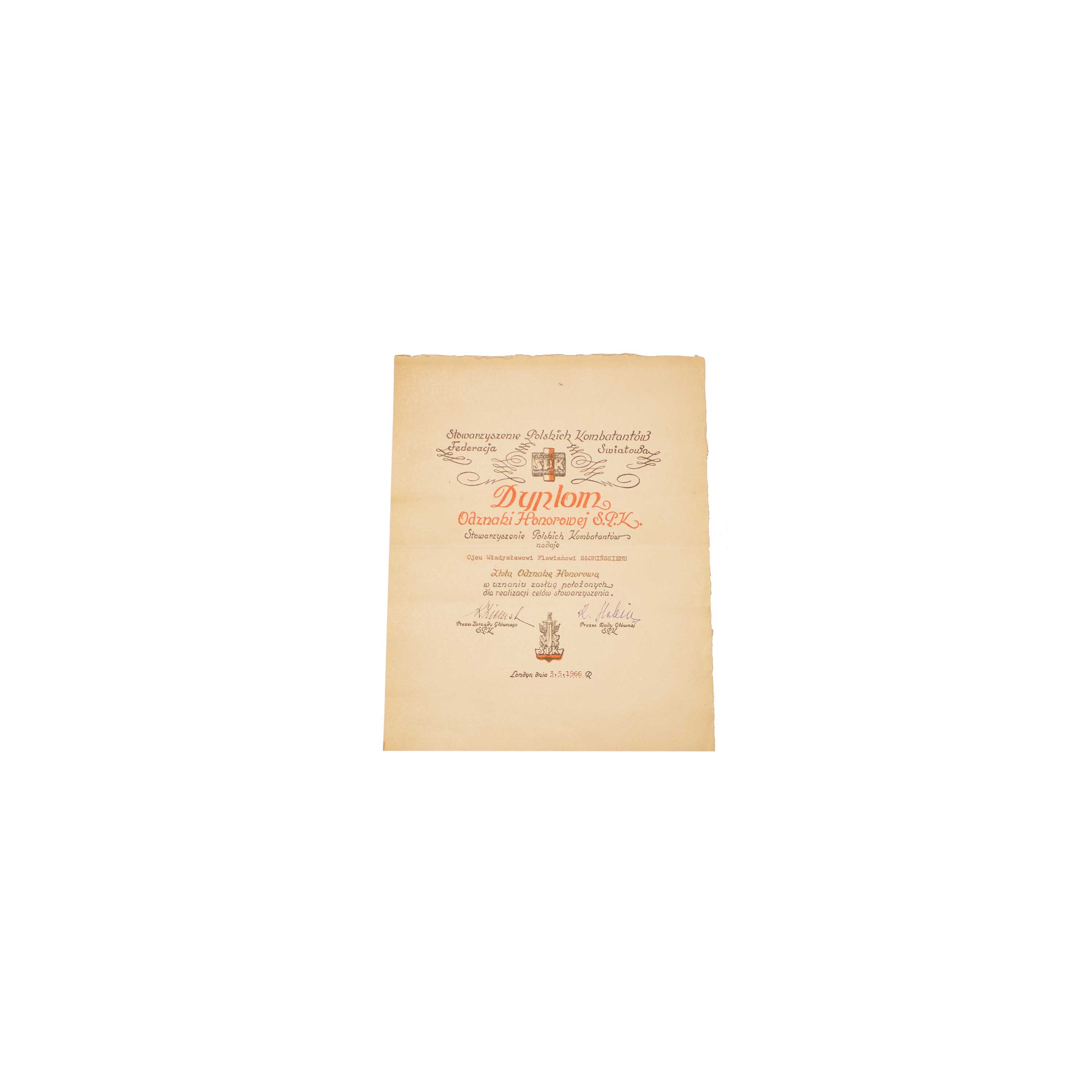 Dyplom potwierdzający nadanie kapelanowi Władysławowi Słomińskiemu Złotej Odznaki Honorowej SPK wraz krzyżem.