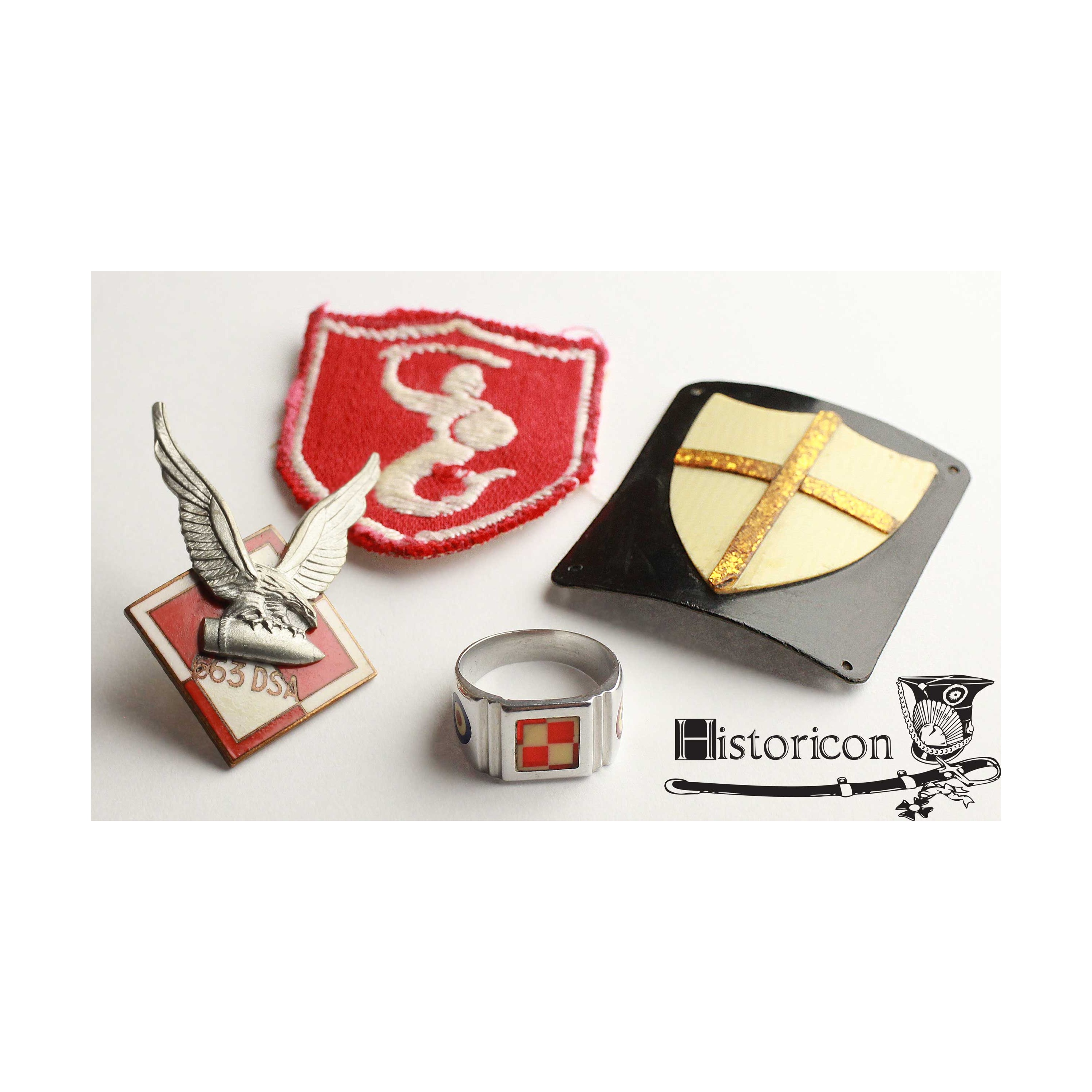 Zestaw pamiątek w skład którego wchodzą: odznaka 663 DSA, dwie naszywki 2 Korpusu oraz sygnet lotniczy.