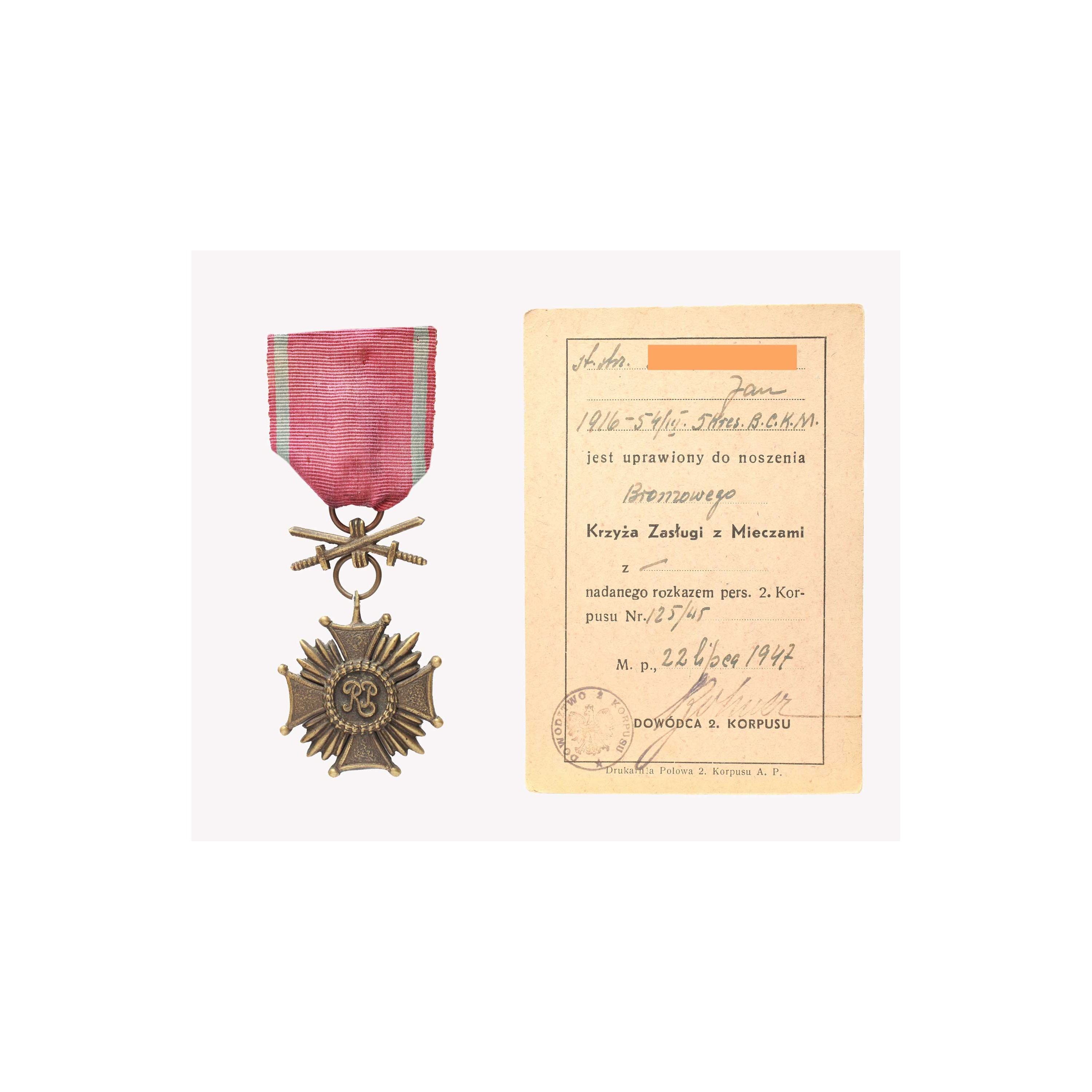 Brązowy Krzyż Zasługi z Mieczami nadany za udział w walkach 2 Korpusu Polskiego we Włoszech.